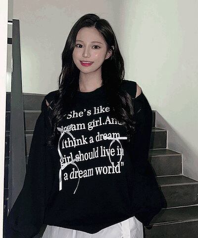 [ラブリー] ショルダーオープン レタリング リボン トレーナー