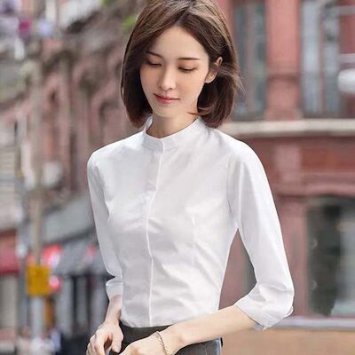 長袖/七分袖ワイシャツレディーススタンドカラーシャツ立ち襟シャツ七分袖シャツ長袖シャツフォーマルシャツスーツシャツ無地シャツブラウス通勤オフィスビジネスフォーマル面接就職仕事着着痩せ大きサイズ春夏