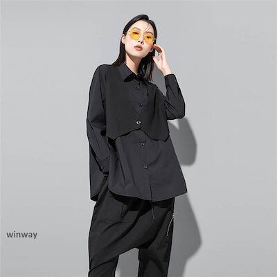 フェイクレイヤード シャツ レディース 配色 トップス ロングシャツ 春 秋 冬 デザイン 長袖 アシンメトリー 無地 個性的 ファッション ゆったり 大きいサイズ