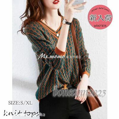 ニットセーター レディース春秋冬 長袖ニットトップス Vネックセーター ゆったりプルオーバー 配色 ニットソー オシャレ韓国風 通勤 着痩せ20代30代