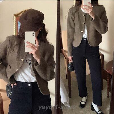 ノーカラー ジャケット レディース 春 秋 スーツジャケット ツイード ノーカラー ショート丈 長袖 コート アウター 羽織り トップス カーディガン とろみコート