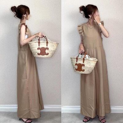 【2枚購入で 2oo円OFF! 】オーバーオール ノースリーブ 木耳縁 オールインワンパンツ ワイドパンツ 着痩せ 体型カバーチュニックキャミワンピース ヘビロテ!キャミワンピース