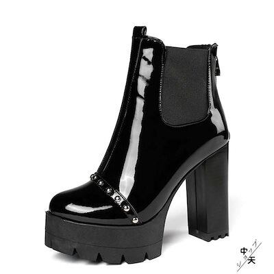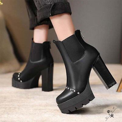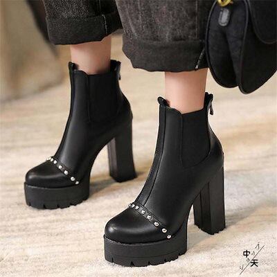 人気品超目玉サイドゴアブーツレディース太めヒール歩きやすい厚底チェルシーブーツアンクルブーツラウンドトゥリベットワークブーツバックジップ秋冬おしゃれ