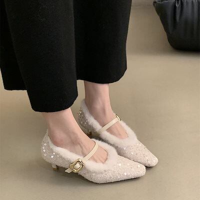 フランス式細とハイヒール韓国モカシン優しい毛羽革靴レディースメアリージェーン靴 ローヒール