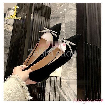パンプス 歩きやすい レディース フラットシューズ トレンド パンプス 黒 キラキラリボン ポインテッドトゥパンプス 春靴 美脚 痛くない 通勤OL 結婚式 オフィス