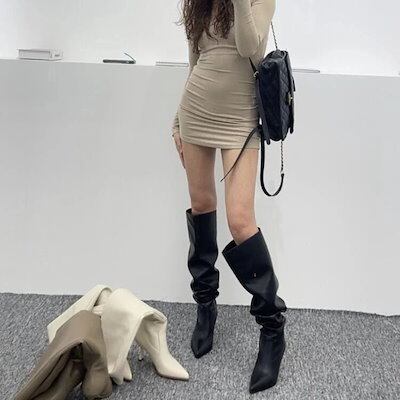 韓国ファッション ロングブーツ 新作 おしゃれ 気質 ポインテッドトゥ 身長アップ 美脚 ブーツ ニーハイブーツ オーバーザニーブーツ 騎士ブーツ 百掛け 厚底