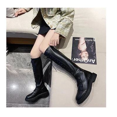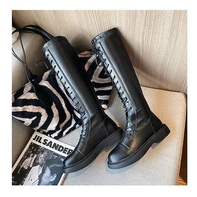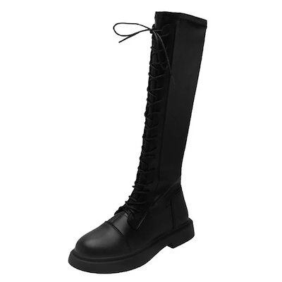 美脚 ロングブーツ レディース 美脚 ブーツ 長靴 紐編み上げ 防寒 歩きやすい おしゃれ ローヒール PU 裏起毛あり カジュアル 秋冬 疲れにくい