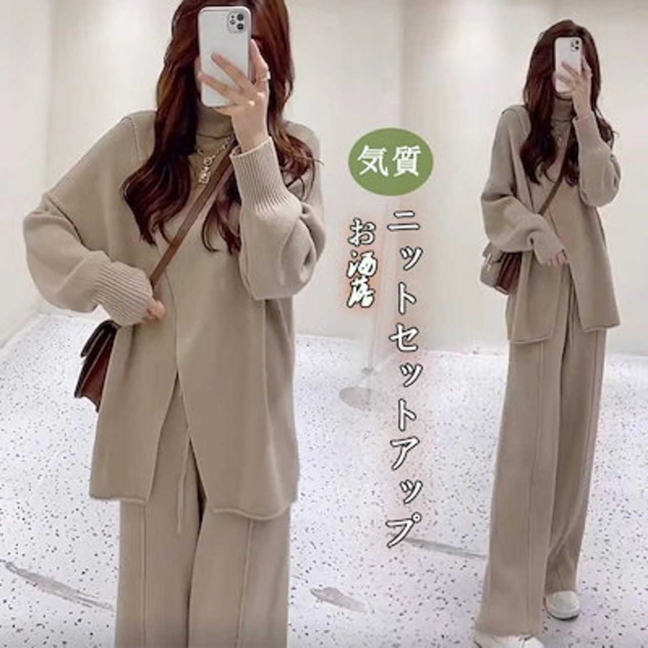 秋冬 新作 おしゃれ 気質 レディースセットアップ ニット アウター 二点セット 上下セット セーター ワイドパンツ セットアップ 通勤 シンプル 福袋