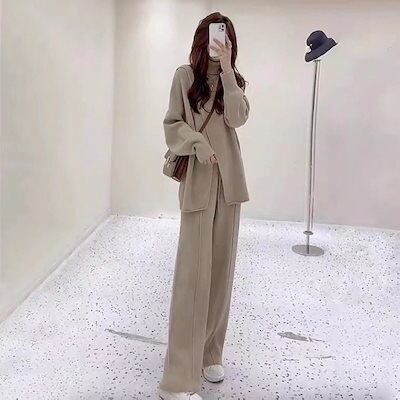 秋冬 新作 おしゃれ 気質 レディースセットアップ ニット アウター 二点セット 上下セット セーター ワイドパンツ セットアップ