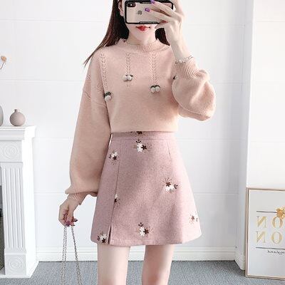 ハイエンドのカスタマイズ-秋冬レディースファッションスーツ新しい韓国風年齢軽減セーター+ウールAラインスカート2点セット