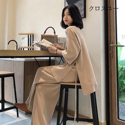 セットアップ ニット レディース 秋と冬 パンツスーツ 上下セット 2点セット トップス セーター スリット ガウチョパンツ ワイドパンツ ロング丈 ゆったり 30代おすすめ商品
