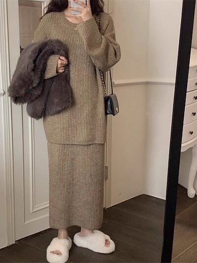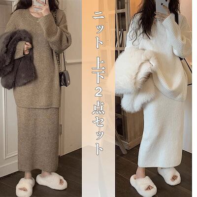 秋冬 セット セーター スカート 上下セット 2点セット 無地 ニットカーディガン スカートロングスカート タイトスカート