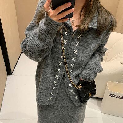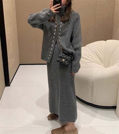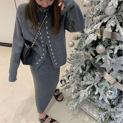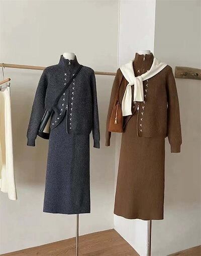 ニット セットアップ レディース 長袖 秋 冬 スカート ロング カーディガン セーター ニットセーター 立ち襟 スタンドカラー ロングスカート ミモレスカート ニットアップ 2点セット 上下 大きい