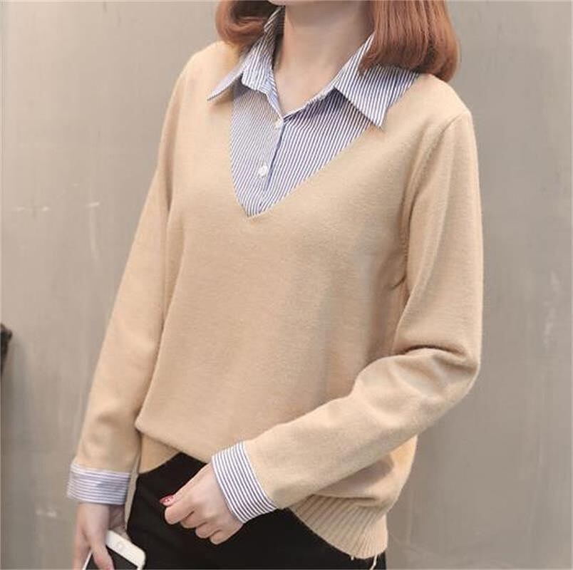 レディーストップス重ね着風Vネック無地セーターニット長袖ストライプシャツカジュアル大人可愛いフェミニ