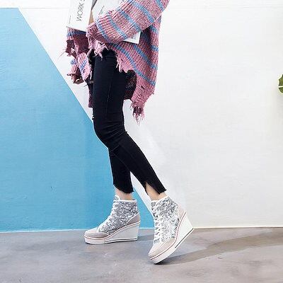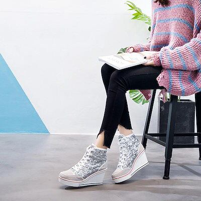 ヒールスニーカーレディーススニーカーハイヒールウェッジソールスパンコールカジュアルシューズ厚底スニーカーハイカットインヒールレースアップ