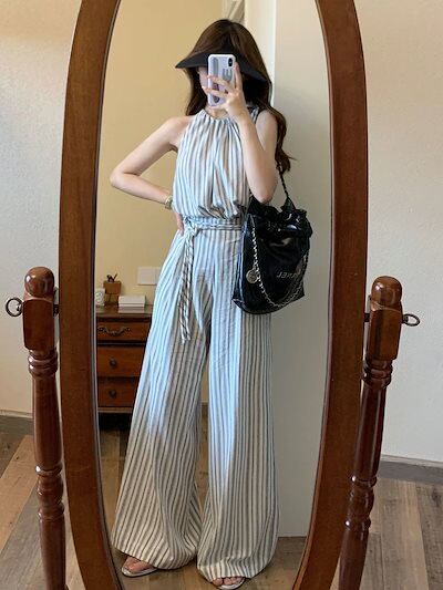 セットアップファッションスーツ レディース 夏 新作 ストライプ ハンギングネック ベスト トップス ハイウエスト スリム ワイドパンツ カジュアルパンツ