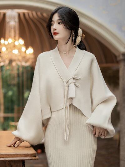 冬用レディースニットスーツスカート2024年無地秋冬優しいレイジースタイルジャケット&ワンピース2点セット