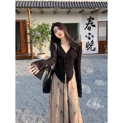 涼しく楽ちんセットアップ ドレス マキシスカート中国風リボントップス水墨風ハイウエストロングスカートレディース夏2024新作ファッションスーツ レディース 韓国ファッション