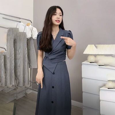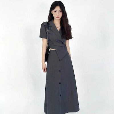 涼しく楽ちんセットアップ ドレス マキシスカートグレーのファッションスーツ女性サマーブレザー+スカートの2着女性 レディース 韓国ファッション