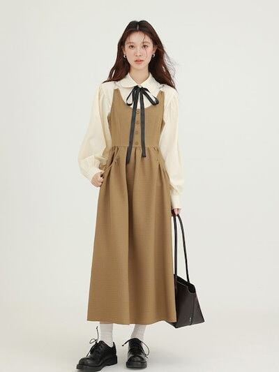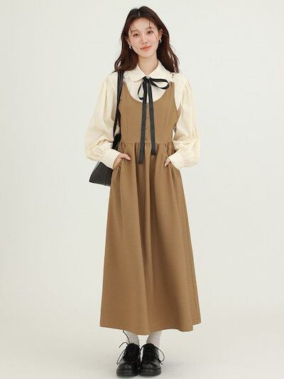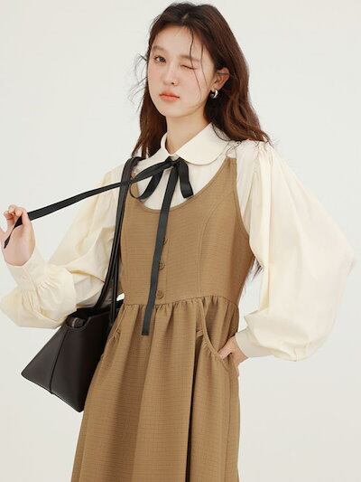 冬アウター 涼しく楽ちんセットアップ秋の女性のためのフランスのレトロな質感のシャツベストドレス女性のためのレイヤードブラウンカジュアルスカートスーツ韓国ファッションおしゃれ