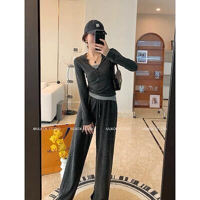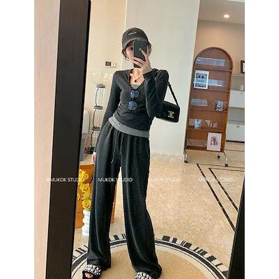レディースカジュアルスリーピーススーツサスペンダー付き長袖ニットセーターハイウエストワイドパンツ秋口スポーツ着痩せフルセット