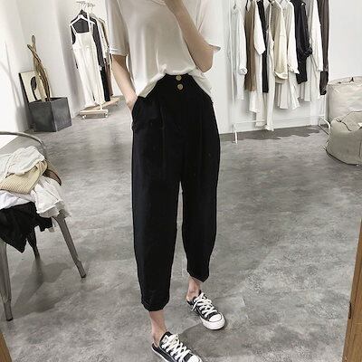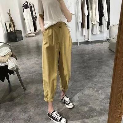 テーパードパンツ ボタンカジュアルパンツレディース新作ハイウエストルーズ韓国ゴムハーレムパンツパンツ