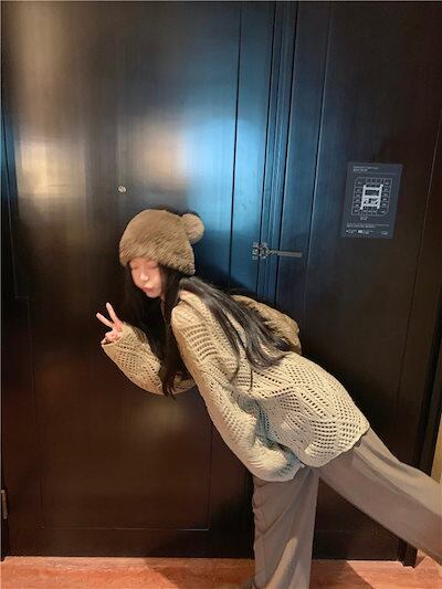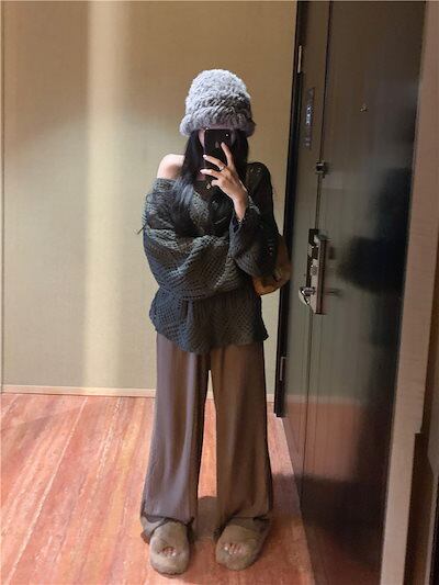 2024秋冬トップス ニット 透かし彫り 長袖 オフショルダー ゆったり 細見え 秋 茶色 おしゃれ かわいい ガーリー キュート 韓国ファッション レディース お出かけ