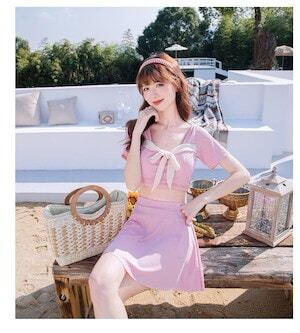 2024 3色 半袖水着 タンキニ 2点セット ツーピース リボン フリル 着痩せ ガーリー プリティ キュート レトロ スリム ミニ ショート丈 可愛い 大人 お姉さん イイ女 スタイルアップ モテ