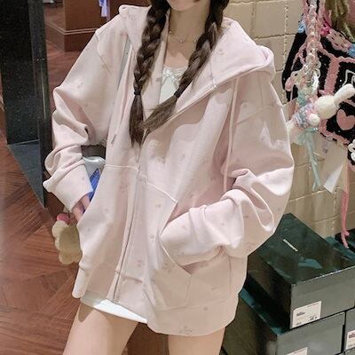 2024 秋冬トップス パーカー フード付き ジップ チャック 長袖 花柄 ポケット 大きめサイズ ゆったり 細見え 秋 水色 おしゃれ かわいい ガーリー キュート 甘め 韓国ファッション レディー