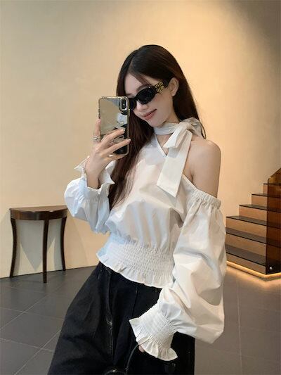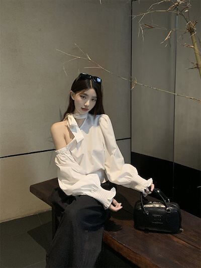 2024秋冬トップス シャツ 長袖 ワンショルダー 肩見せ リボン 秋 白 ホワイト おしゃれ かわいい きれいめ 大人っぽい 韓国ファッション レディース お出かけ