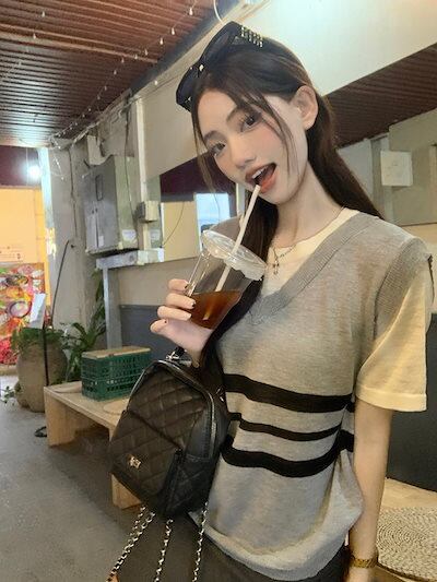 2024秋冬トップス ベスト ニット Vネック ボーダー 半袖 グレー 秋 ゆったり 韓国ファッション レディース おしゃれ かわいい カジュアル お出かけ