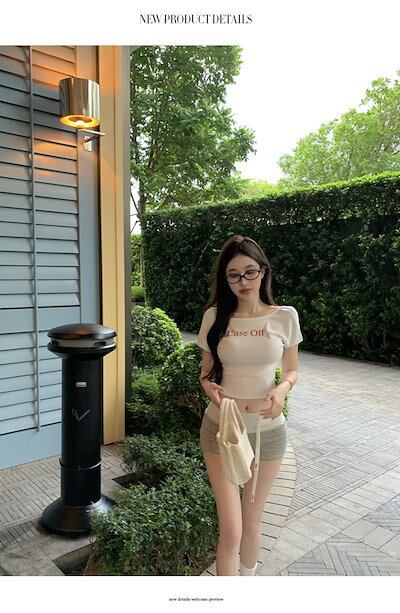 2024 春夏 甘い トップス Tシャツ ラウンドネック丈 休日 フレンチ プリント 韓国 ブラウス ファッション系 タイト スリムフィット丈短め半袖 ショートレディースへそ出し休日おしゃれT