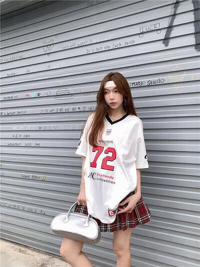 2024 夏 韓国可愛い風トップス Tシャツ ファッション系 半袖 スリムフィット サイド ペイントシルエットゆったり丈 休日レディースサイズ韓国Vネック おしゃれ カジュアル メンズライク T