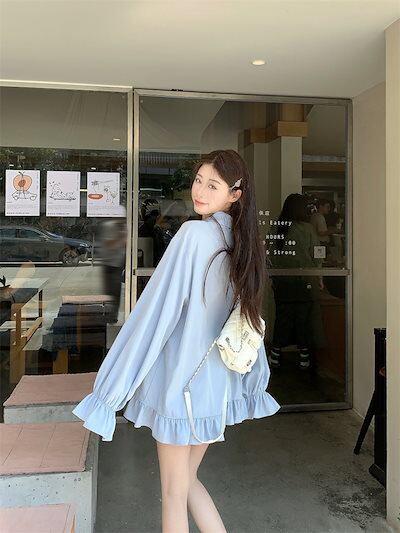 2024夏トップス シャツ 長袖 ボタン 襟 スタンダードカラー ハート キャンディスリーブ ゆったり 細見え 夏 水色 ライトブルー おしゃれ かわいい ガーリー キュート 甘め 韓国ファッション