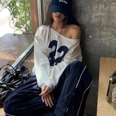 2024 夏トップス スウェット 長袖 ワンショルダー 数字 22 肩見せ ゆったり 細見え 夏 ホワイト 白 おしゃれ かわいい 韓国ファッション レディース お出かけ