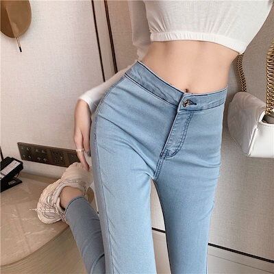 【3日以内出荷】脚長効果!スキニーデニムパンツ スキニー ライトブルー ジーンズ 春秋 ハイウエスト レディース スリム ストレッチ 9分丈パンツ ペンシルパンツ 韓国