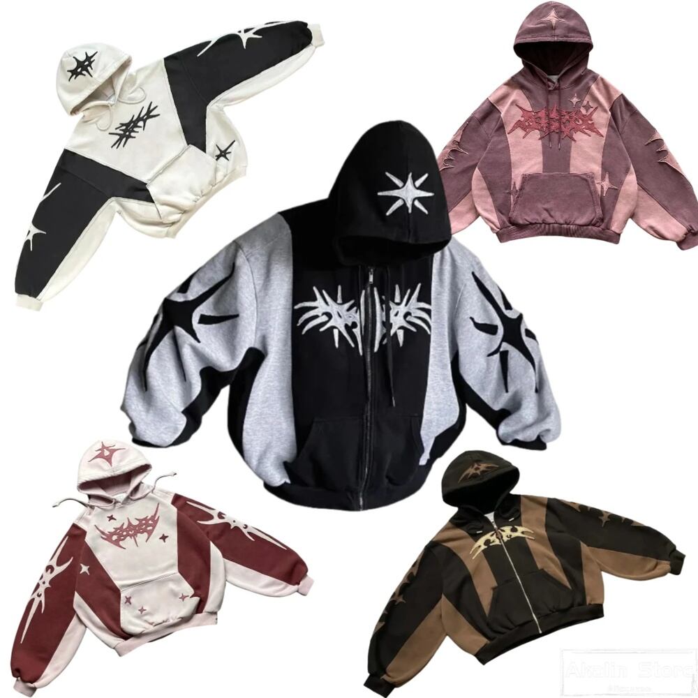 男性用ルーズジップパーカー、y2kパッチデザイン、幾何学模様、スプライススウェットシャツ、ゴシックストリートウェア、特大カジュアルウェア y2k ボトムス T240901094956_05