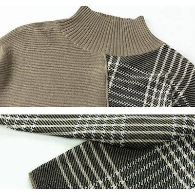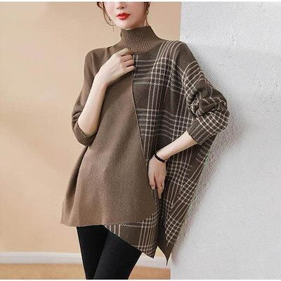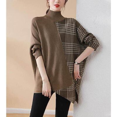 ニット セーター レディース トップス 秋 冬 セーター 長袖 チェック ハイネック アシンメトリー プルオーバー ニットセーター ニットソー 切り替え