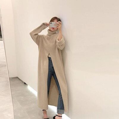 ニットトップス レディース 秋冬 40代 長袖トップス 無地セーター ハイネック スリット ロング丈 ニットワンピース ひざ下 プルオーバー 韓国風 オシャレ