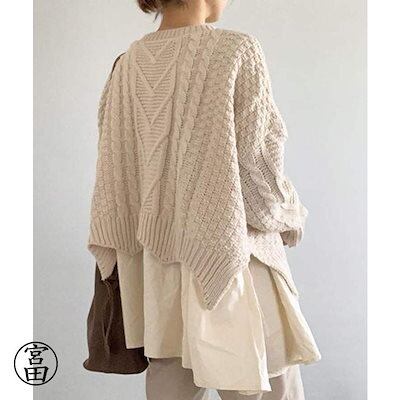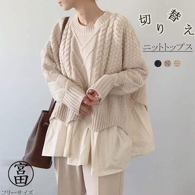 切り替え ニット セーター レディース 長袖 秋冬 ニットセーター レイヤード風 丸首 ケーブル編み 長袖ニット 重ね着 ふんわり ハンカチヘム クルーネックニッ