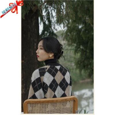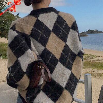 ニット セーター カーディガン プルオーバー レディース 春 秋 冬 ゆったり 体型カバー オフィス シンプル トップス 長袖 ひし形 前開き おしゃれ