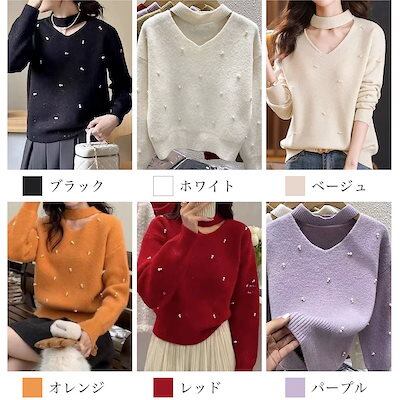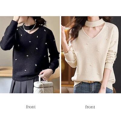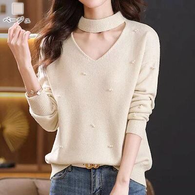 セーター レディース Vネックパールセーター ロング おしゃれ トレーナー ニットセーター 黒 ゆる 春 ざっくり 人気 Vネック ニット 厚手 ハイネック 洗える 柄 タートルネック ふわふわ ノル