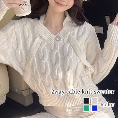セーター レディース 2wayケーブルニットセーター 柄 タートルネック ニット ノルディック クルーネック ブランド 白 トレーナー 冬 Vネック 長袖 厚手 人気 ふわふわ ケーブル編み ロング