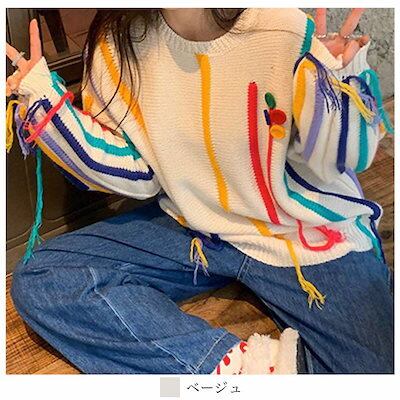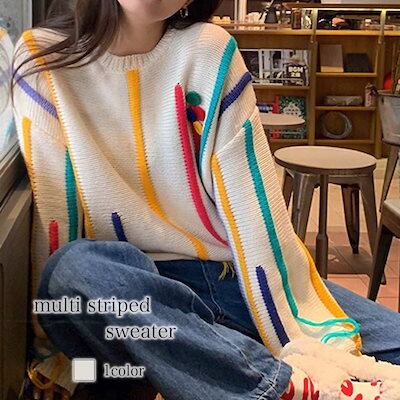 セーター レディース マルチストライプセーター ロング おしゃれ トレーナー ニットセーター 黒 ゆる 春 ざっくり 人気 Vネック ニット 厚手 ハイネック 洗える 柄 タートルネック ふわふわ ノ