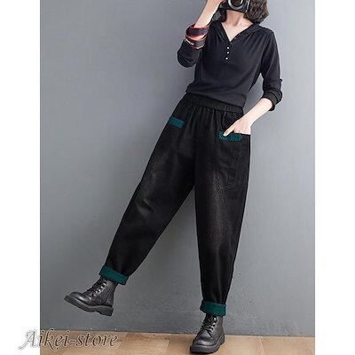サルエルパンツ デニム 裏起毛 テーパードパンツ ボトムス ズボン レディース カジュアル ポケット付き ゆったり ウエストゴム 無地