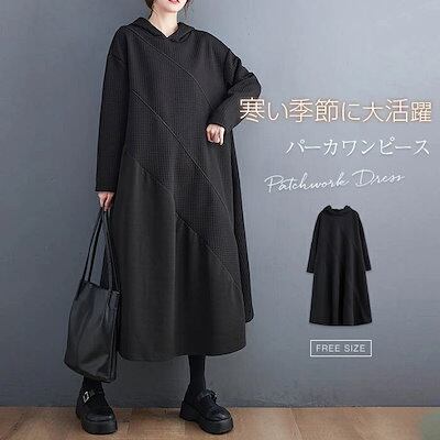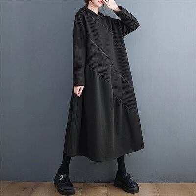 ワンピース ロングワンピース 秋冬 レディース 長袖 ロングワンピ aライン パーカーワンピース 冬 黒ワンピース 体型カバー マキシ丈 着痩せ 大きいサイズ フレア 無地 切替 フード付き カジュア