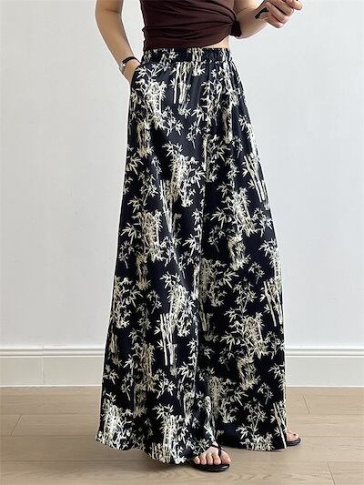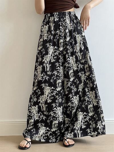 ワイドパンツ ひんやり 竹柄パンツ レディース 夏 フレアパンツ 涼しい ガウチョパンツ ロングパンツ リゾート 花柄 バギーパンツ 大きいサイズ ゆったり シフォン リラックス ビーチ 海 爽やか