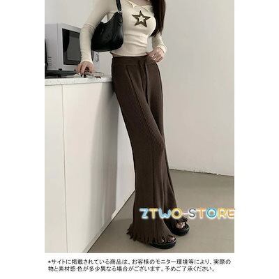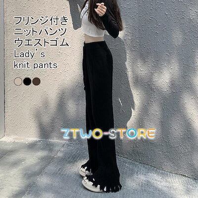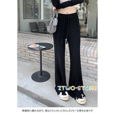 ワイドパンツ レディース ロングパンツ リブニット 裾フレア フリンジ ウエストゴム 紐付き 伸縮性 細身 美脚 シンプル 春秋