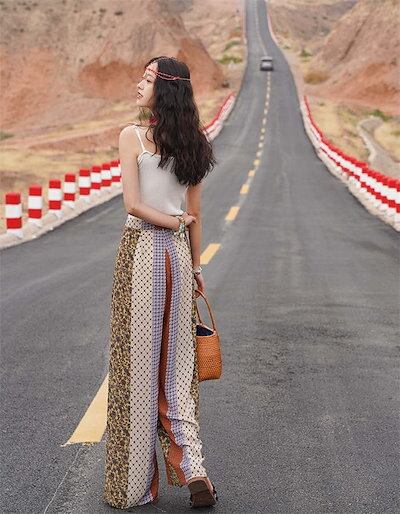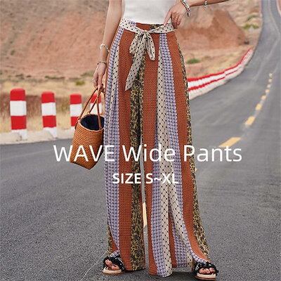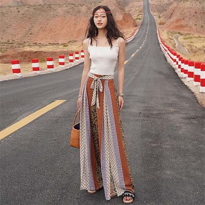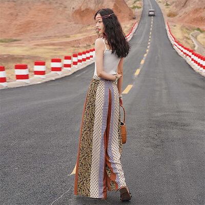 ワイドパンツ レディース ロング パンツ 総柄 エスニック柄 きれいめ 夏 春 薄手 涼しい ロングパンツ ワイド ガチョウ スカンツ ハイウェスト 柄パンツ フレアパンツ 美脚パンツ ゆったり シフ