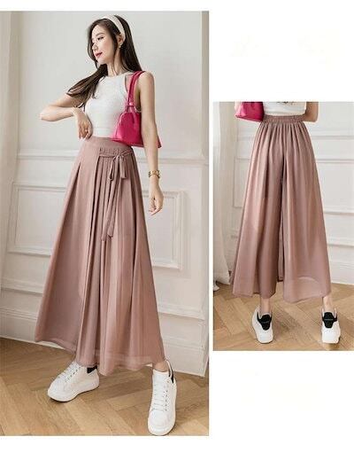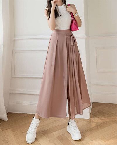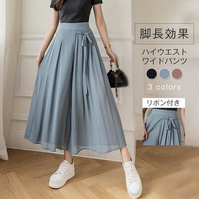ワイドパンツ レディース ガウチョパンツ シフォン プリーツ フレアパンツ ボトムス スカーチョ ゆったり レディース オシャレ リボン 着痩せ 美脚 スカート風 おしゃれ カジュアル 通勤 きれいめ